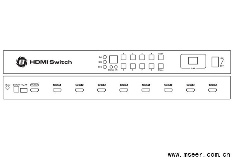 本產(chǎn)品為8x1HDM切換器,通過本產(chǎn)品,你可以任意選擇8個輸入源中的一個輸出到一臺顯示器上。